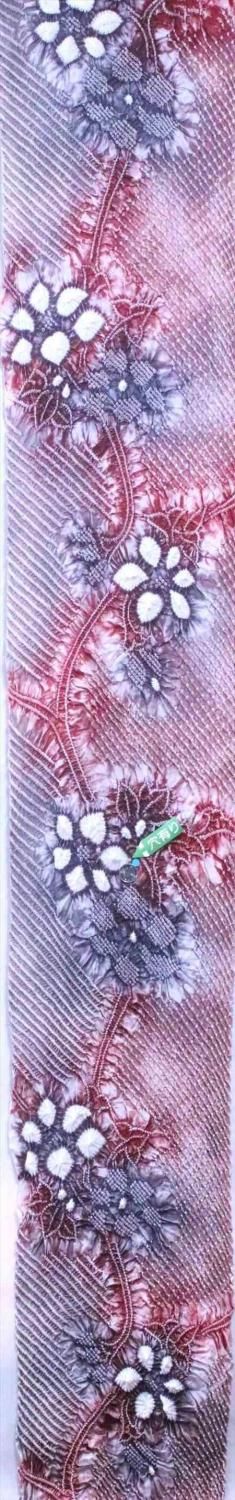 絞りゆかた・反物・綿100%・長さ12m・巾37cm・生地…日本・絞り加工…カンボジア・染色…日本。浴衣・ワンピース・のれん・インテリア・袋物・各種カバー・民芸品等、手芸の材料にご利用下さい。地色はワイン地にグレー地です。絞りの浴衣は独特の染色でありますので、多少の染めムラはご容赦ください。お手元に届きまして、イメージと違うようでしたら、裁断される前に至急ご返送ください。