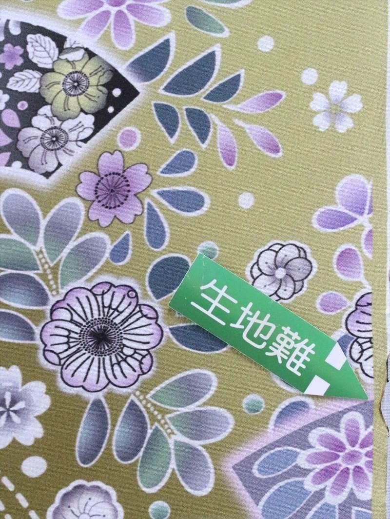 • ポリエステル 洗える 付下 反物 No.54   扇面柄・鶸(ひわ)色・訳あり(3)ポリエステル 洗える 付下 反物 No.54   扇面柄・鶸(ひわ)色・訳あり(3)
